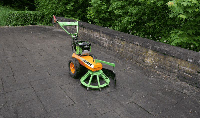 Il portaspazzole con 8 spazzole annodate regolabili viene messo in rotazione tramite leva manuale. Il portaspazzole ruota a soli 180 giri/min in modalità ECO e a 195 giri/min in modalità Turbo. La bassa velocità rispetto a un decespugliatore riduce al minimo il rischio di proiezione di pietre. Con l’uso del telo protettivo opzionale, la dispersione dello sporco è ridotta al minimo. Ruotando il telo protettivo sul lato destro della macchina, il materiale spazzato viene depositato in andane, semplificando notevolmente lo smaltimento successivo. L’elevata forza di spazzolatura è ottenuta grazie a un riduttore meccanico: è praticamente impossibile bloccare la spazzola in rotazione durante il lavoro. Un anello metallico attorno al portaspazzole impedisce alle spazzole di urtare angoli, bordi e ostacoli.